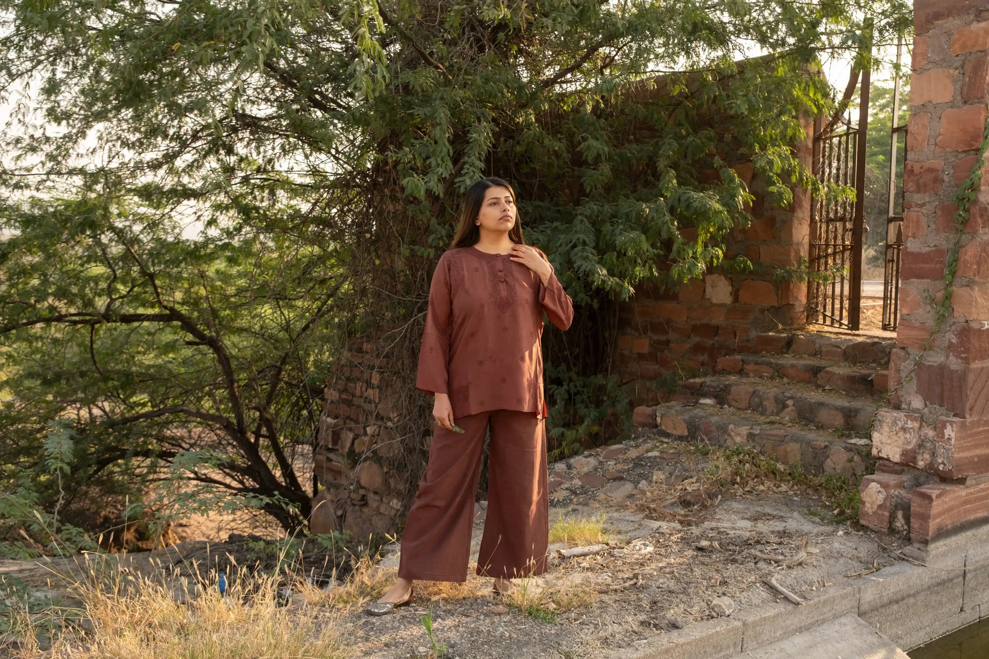Amhara Chikankari Silk Co-ord Set (2 Pieces) - Cocoa Brown
