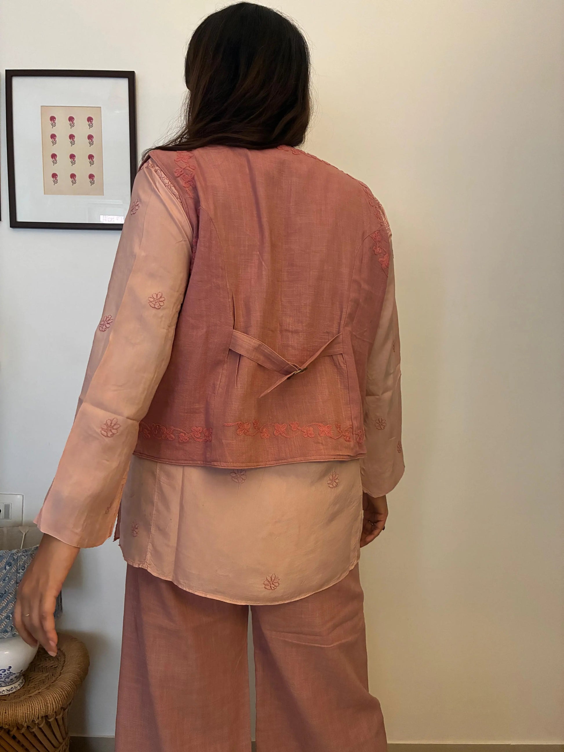 Three-Piece Koti Set with Soft Silhouettes & an Understated Charm. Designed for occasions that call for quiet sophistication, this three-piece ensemble is crafted for ease and quiet refinement. The set features a soft silk top detailed with intricate Chikankari, offering a touch of understated charm. Layered over it is a sleeveless koti with an adjustable band, allowing you to tailor the fit: structured when you want definition, relaxed when you don’t.