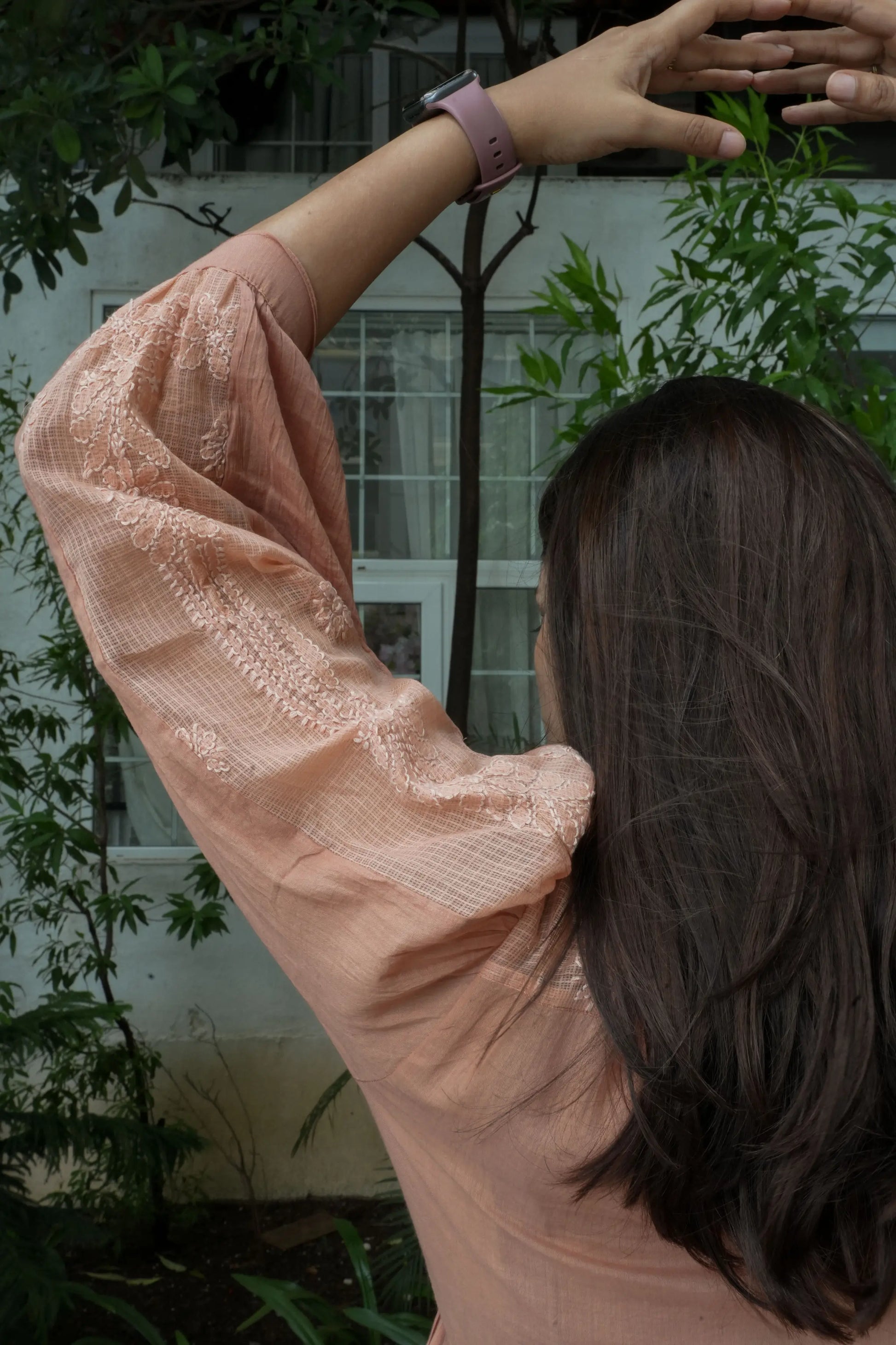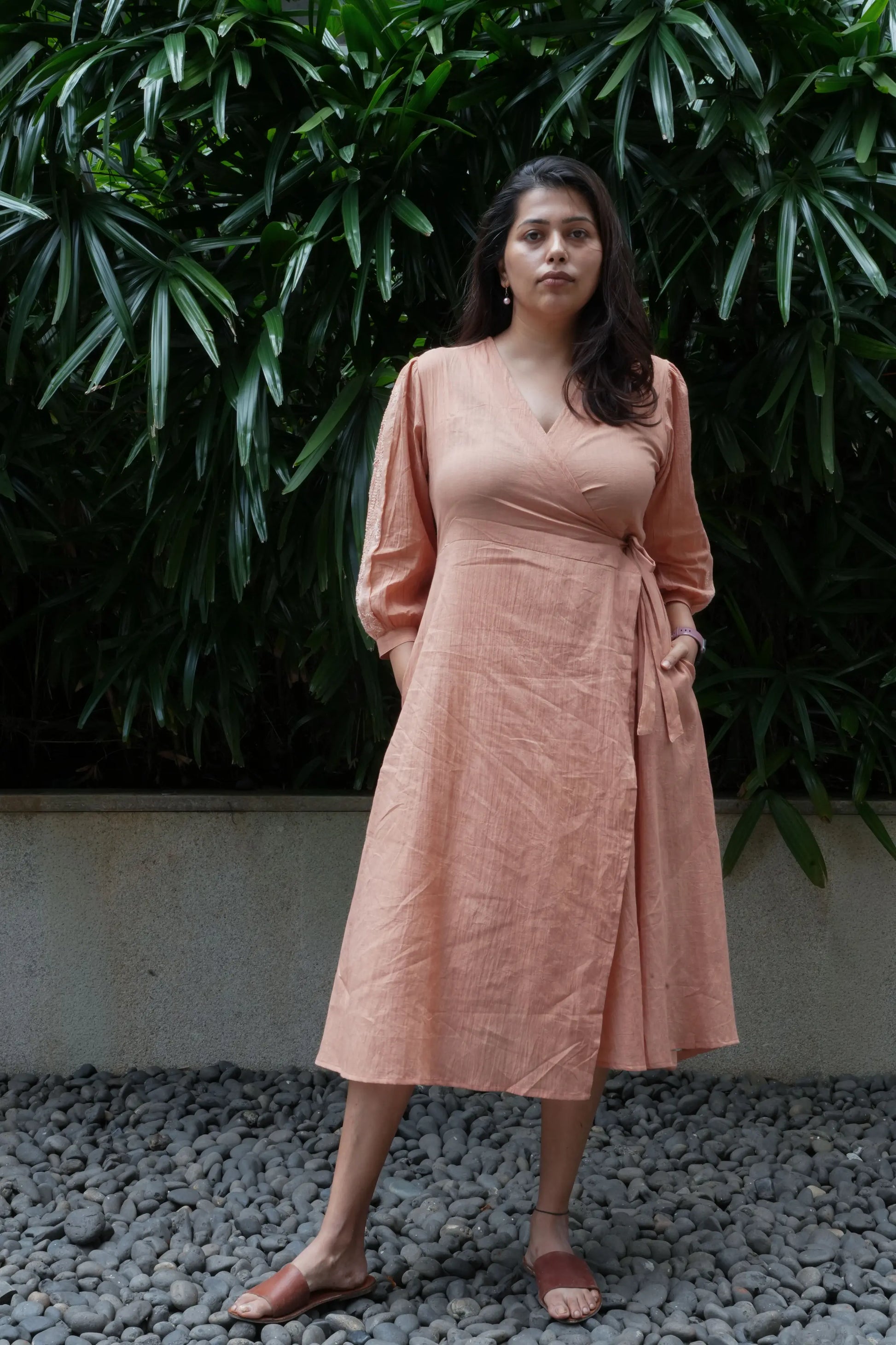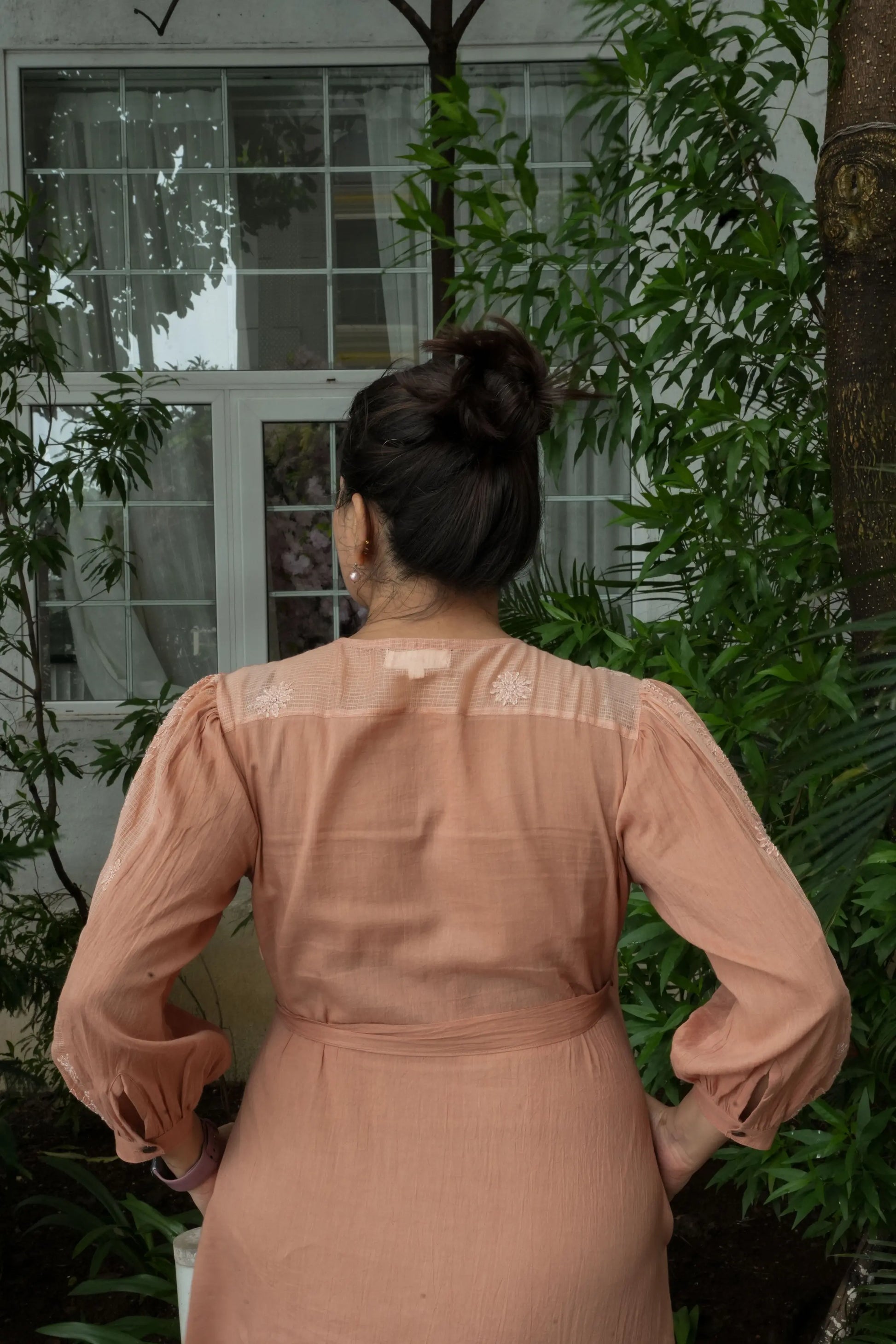 A midi-length wrap dress made in soft cotton fabric with a belt fastening on the side. Chikankari embroidered sleeves and shoulder details in kota doria.